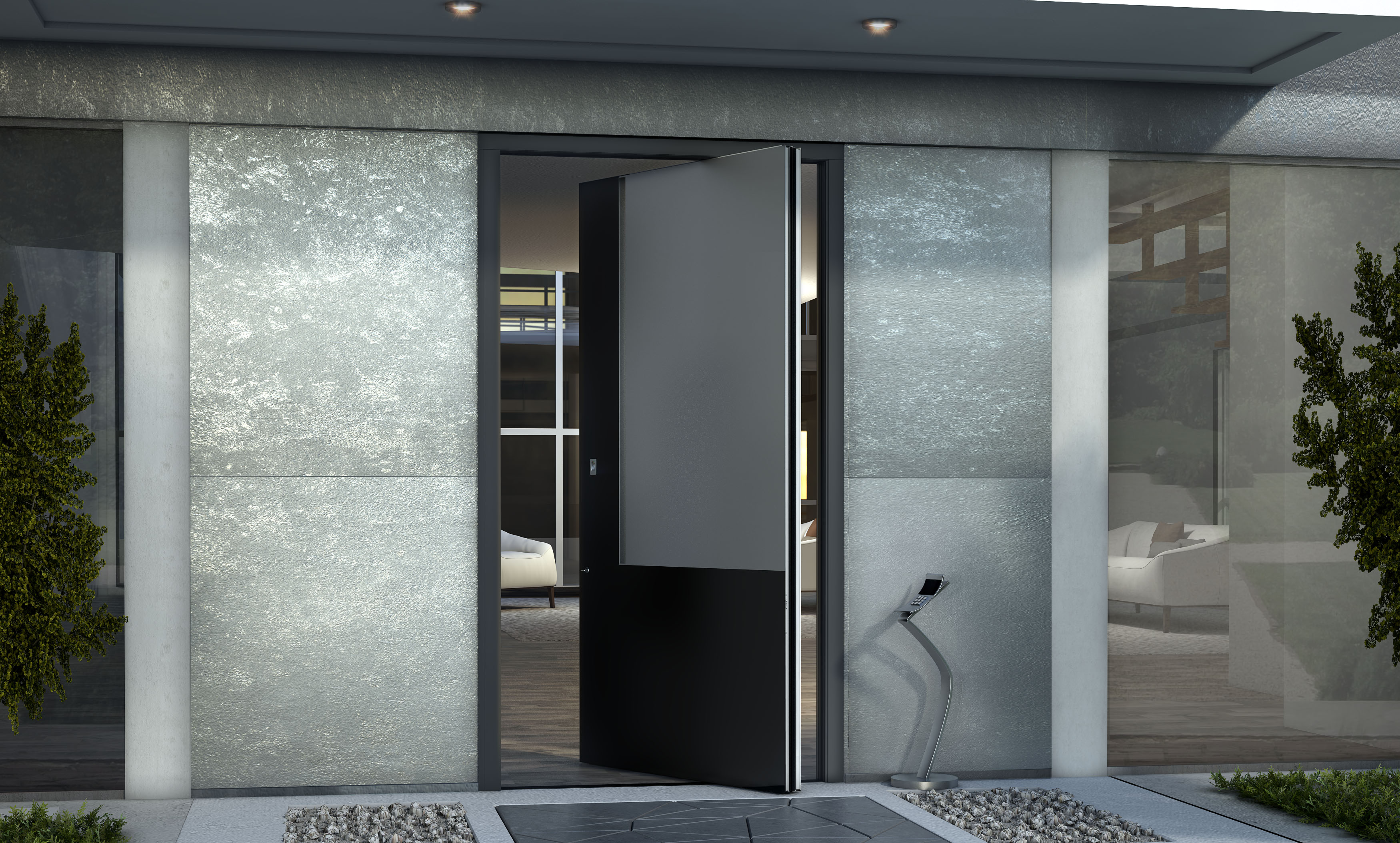 Diese beeindruckende Eingangstür kombiniert einen einzigartigen Schwenkmechanismus mit sehr hohen Leistungen in Bezug auf Wärmedämmung, Luftdurchlässigkeit, Windlast und Einbruchschutz. Pivot Entrée ist in verschiedenen Ausführungen mit Aluminium-, Glas- oder Inox-Deko-Elementen erhältlich und ist die ideale Wahl für alle, die Eleganz, Design und hervorragende Leistung suchen.