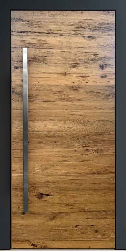 Ecken und Kanten, Astlöcher und Risse prägen den Charakter. Die massiven Bohlen aus uriger Eiche vermitteln einzigartige Originalität. Jede Planke ist so einzigartig, wie die Sturmeiche, deren Holz in diesen Haustüren weiterlebt.